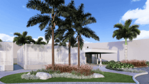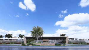 As áreas de lazer incluem quadras de beach tênis, rodeadas por vegetação exuberante, como palmeiras altas e arbustos tropicais coloridos, proporcionando um ambiente dinâmico para os moradores praticarem esportes ao ar livre.