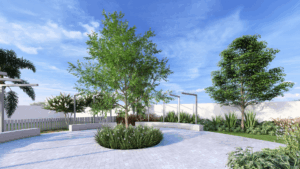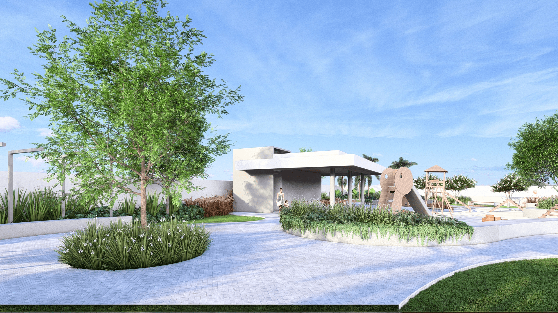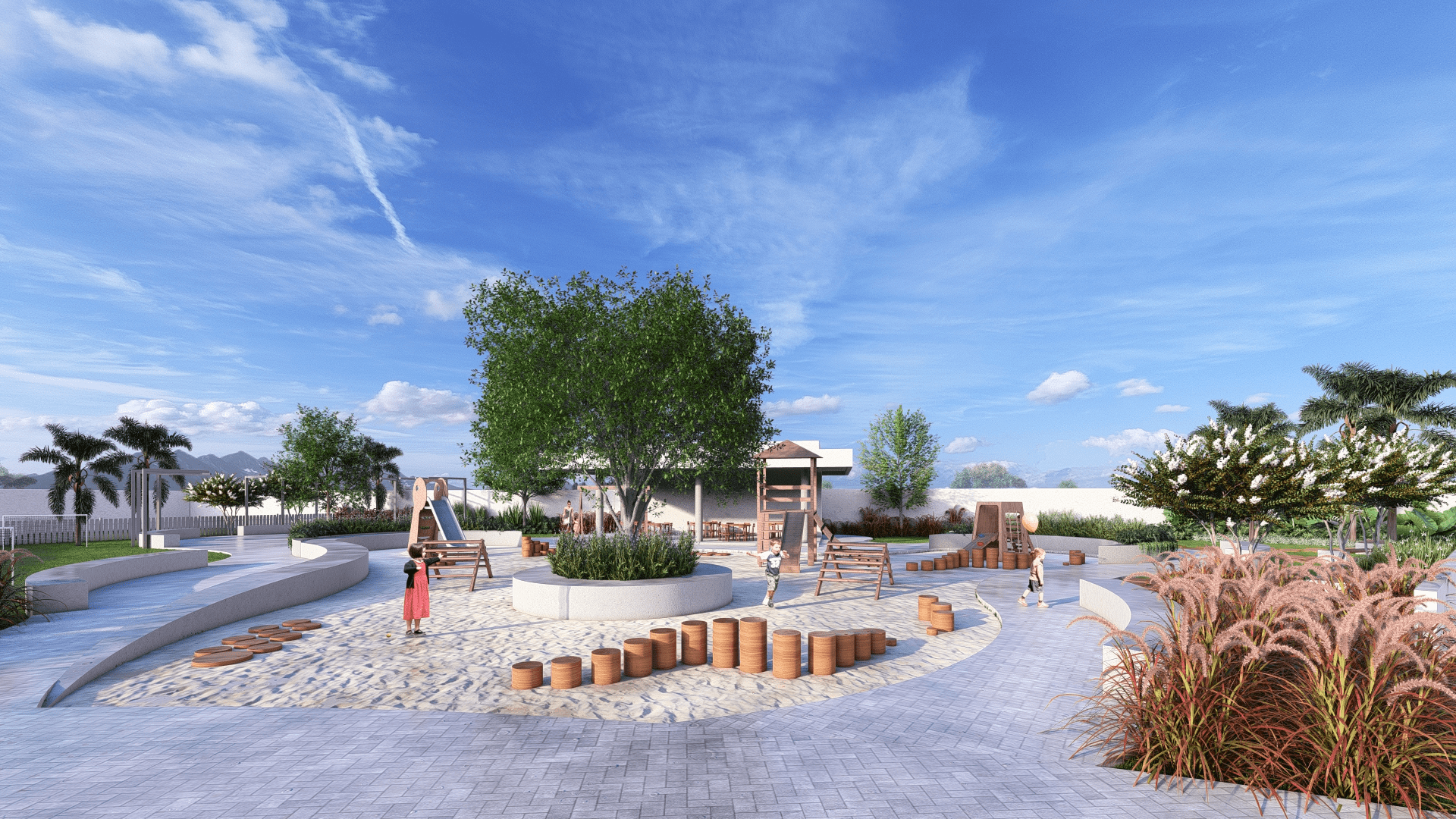 O playground é cercado por árvores de sombra e arbustos floridos, oferecendo um espaço seguro e divertido para as crianças explorarem.